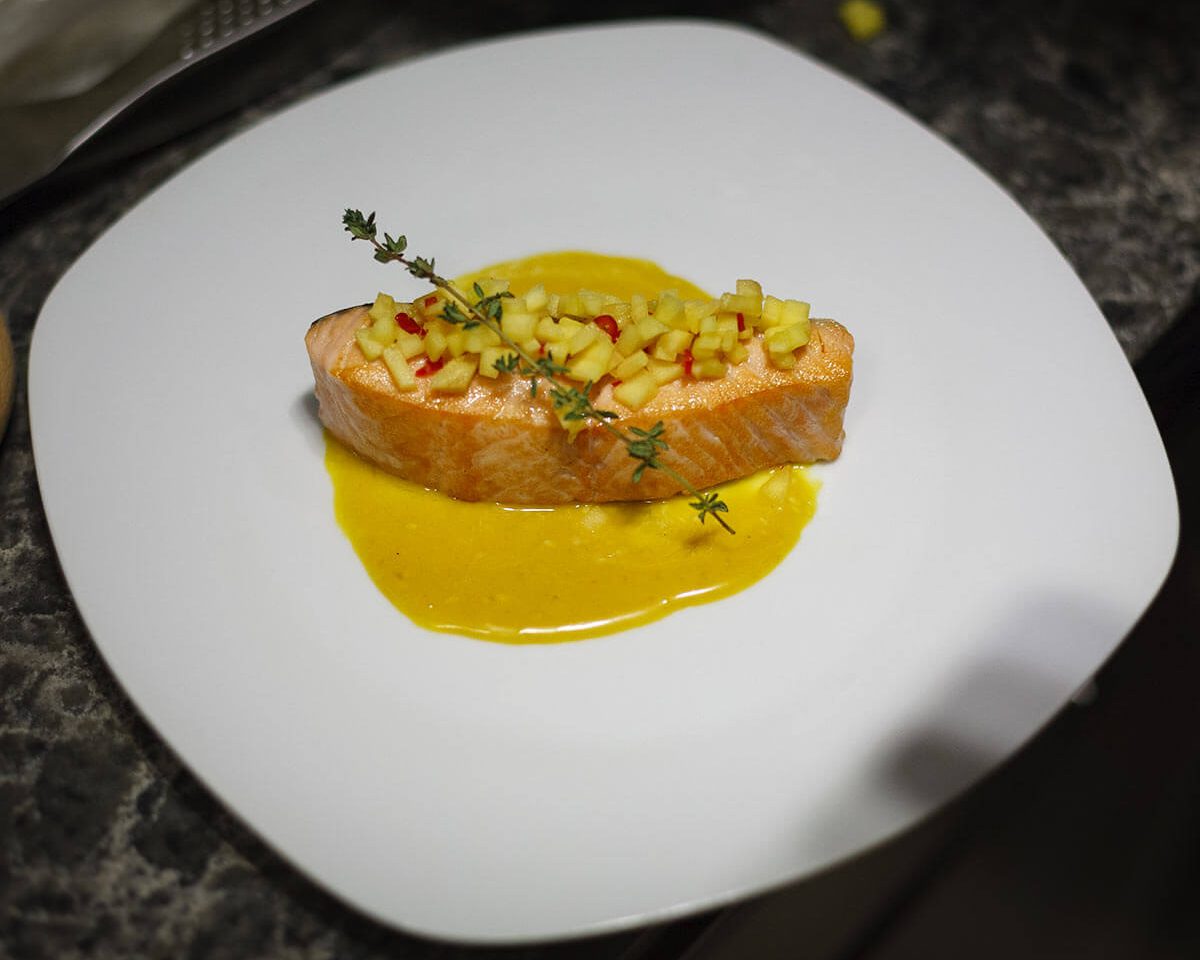 - Лосось с соусом Карри-Голландез и манговым чатни с чили