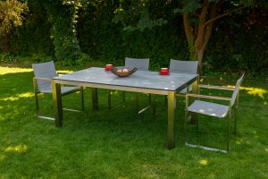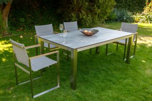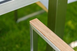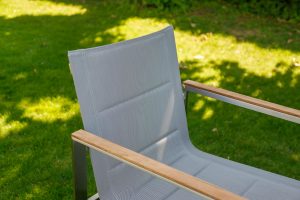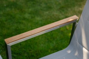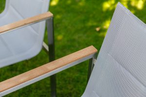 Підлокітники з тикового дерева вдало контрастують з лаконічним дизайном стільця Colombia від бренду Nicolas. Каркас стільця зроблений з нержавіючої сталі, яка відповідає галузевому стандарту для вуличних меблів. Вона має особливий блиск, стійка до корозії та легка в очищенні. Сидіння і спинка виконані з сучасної тканини Textilene — сітка індустріального плетіння з поліестерової нитки з вініловим покриттям. Ця тканина не вбирає вологу, пропускає повітря і завдяки цим властивостям швидко просихає. Вона стійка до погодних умов, вологи та сонячних променів. Textilene має гладку, приємну, холодну поверхню, а також стильний дизайн плетіння. Завдяки додатковому шару тканини, стілець Colombia більш м’який і стійкий до навантажень.
